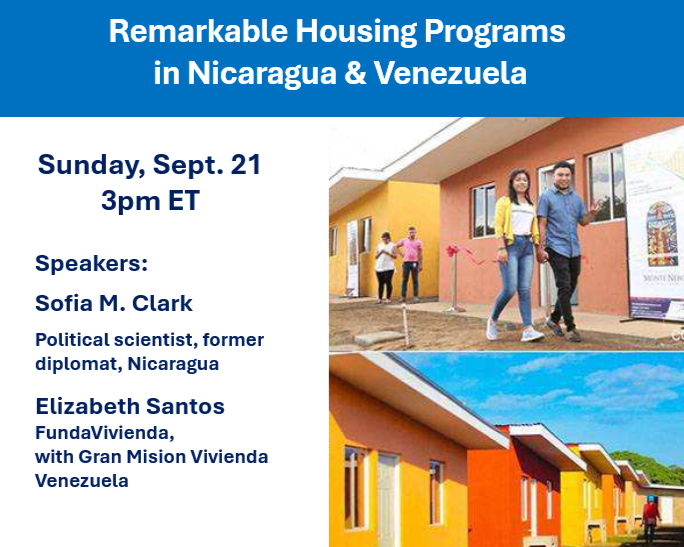 Learn how Nicaragua and Venezuela are providing dignified social housing to huge numbers of their citizens at zero or low cost. English recording is here.